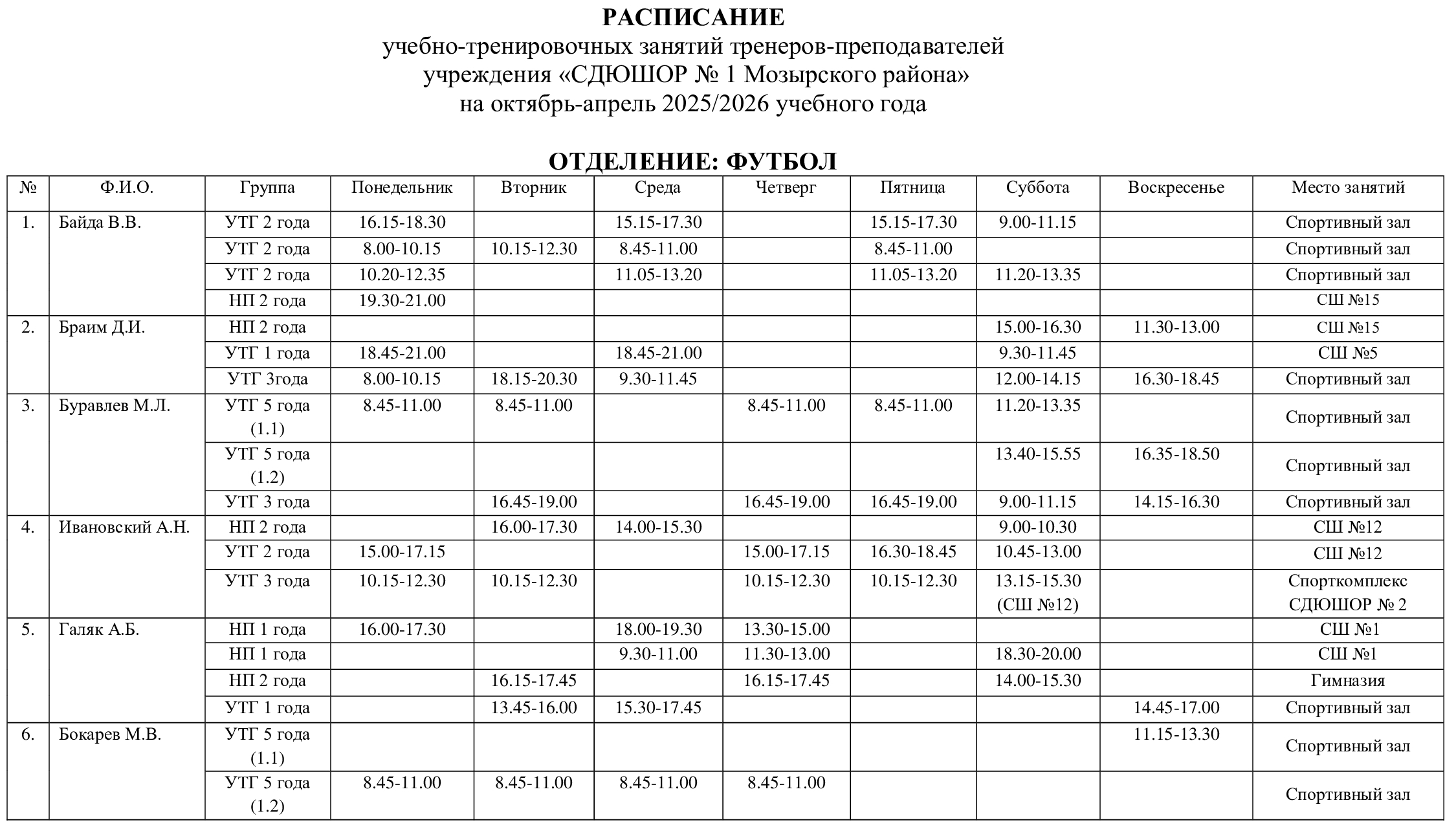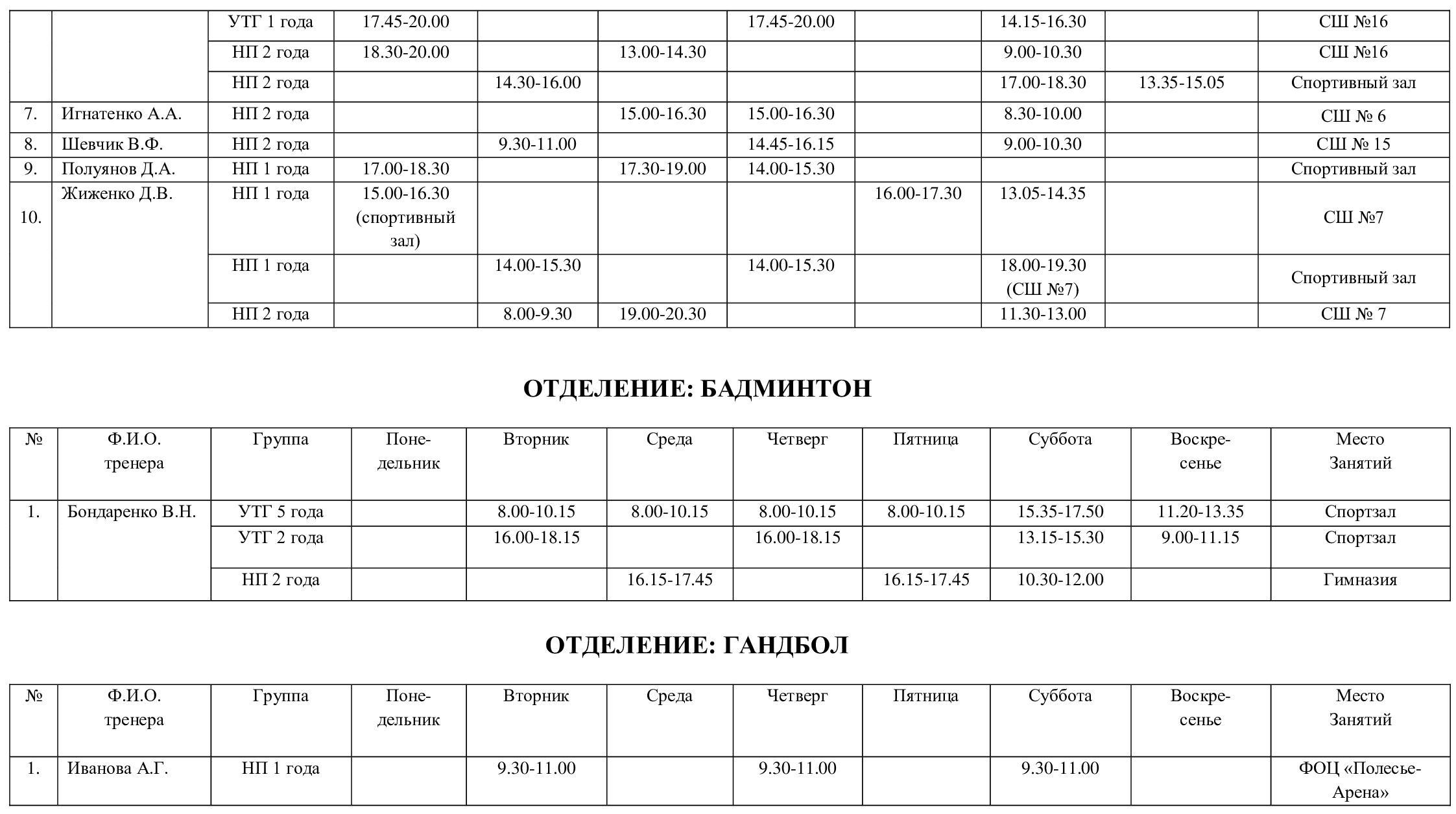 Расписание тренировок
